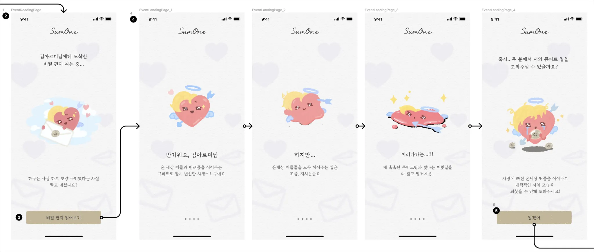 그렇기에 썸원의 강점인 캐릭터 IP를 적절히 활용해 세계관에 몰입할 수 있도록, 랜딩 페이지를 제작했다. 어느 날 메인 화면에 띄워진 이벤트 아이콘을 확인한 후, 랜딩 페이지를 통해 자연스레 스토리를 접할 수 있게 했다.