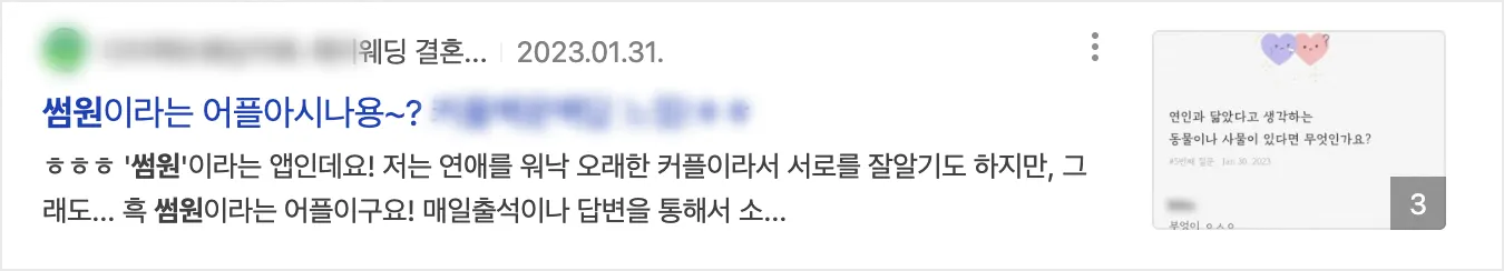 썸원은 별도의 마케팅 없이 출시 1년만에 앱 피쳐드에 등록되고 DAU 1백만을 달성하는 특별한 경험을 한 서비스이다. 좋은 프로덕트를 기반으로한 사용자의 자발적인 콘텐츠 제작과 참여, 그들 사이의 입소문 효과 덕분에 마케팅 없이도 가파르게 성장할 수 있었다. 특히 <결혼>, <곰신> 등 연애와 관련된 특정 커뮤니티에서 특히 더 자주 발생하고 있다.