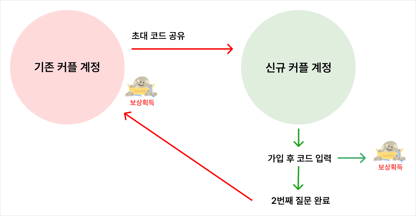 기존 커플의 보상 수령 타이밍을 두번째 질문으로 둔 이유는, 어뷰징 문제도 있었지만 무엇보다 다음과 같았다. 두번째 질문을 완성했을때 유저는 매일 질문 받을 썸원 타임을 설정할 수 있고, 반려몽의 성장을 한 번 경험한다. 답변을 통해 사랑을 확인하고 반려몽을 육성하는 사이클을 경험하는 것이 습관화로 들어가는 시작점이라고 판단했다. 그 경우 신규 커플이 우리 서비스에 문제 없이 안착할 것이라는 자신감이 있었다.