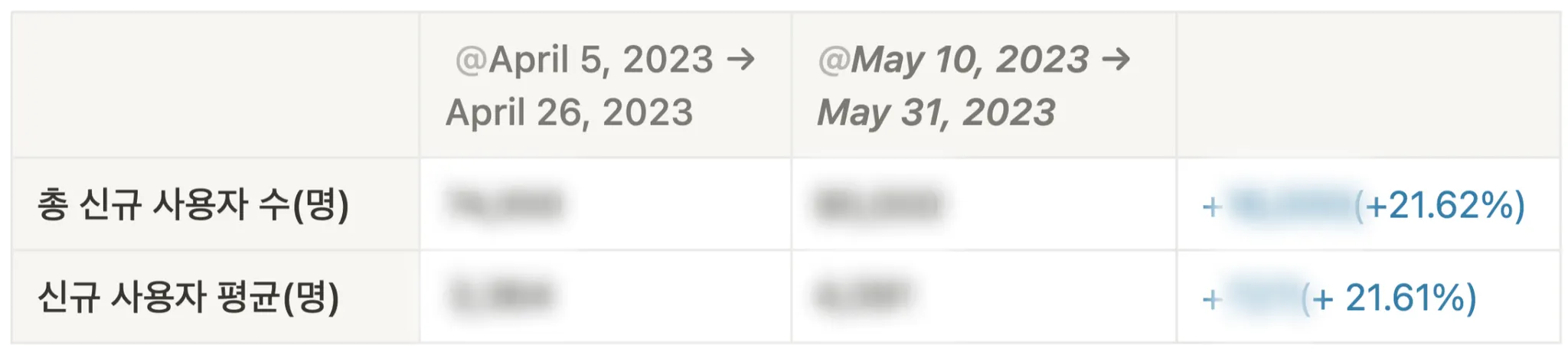 결과적으로 해당 기간 21.6%의 신규 사용자를 획득했으며, TF팀의 KPI를 300%이상 달성했다.