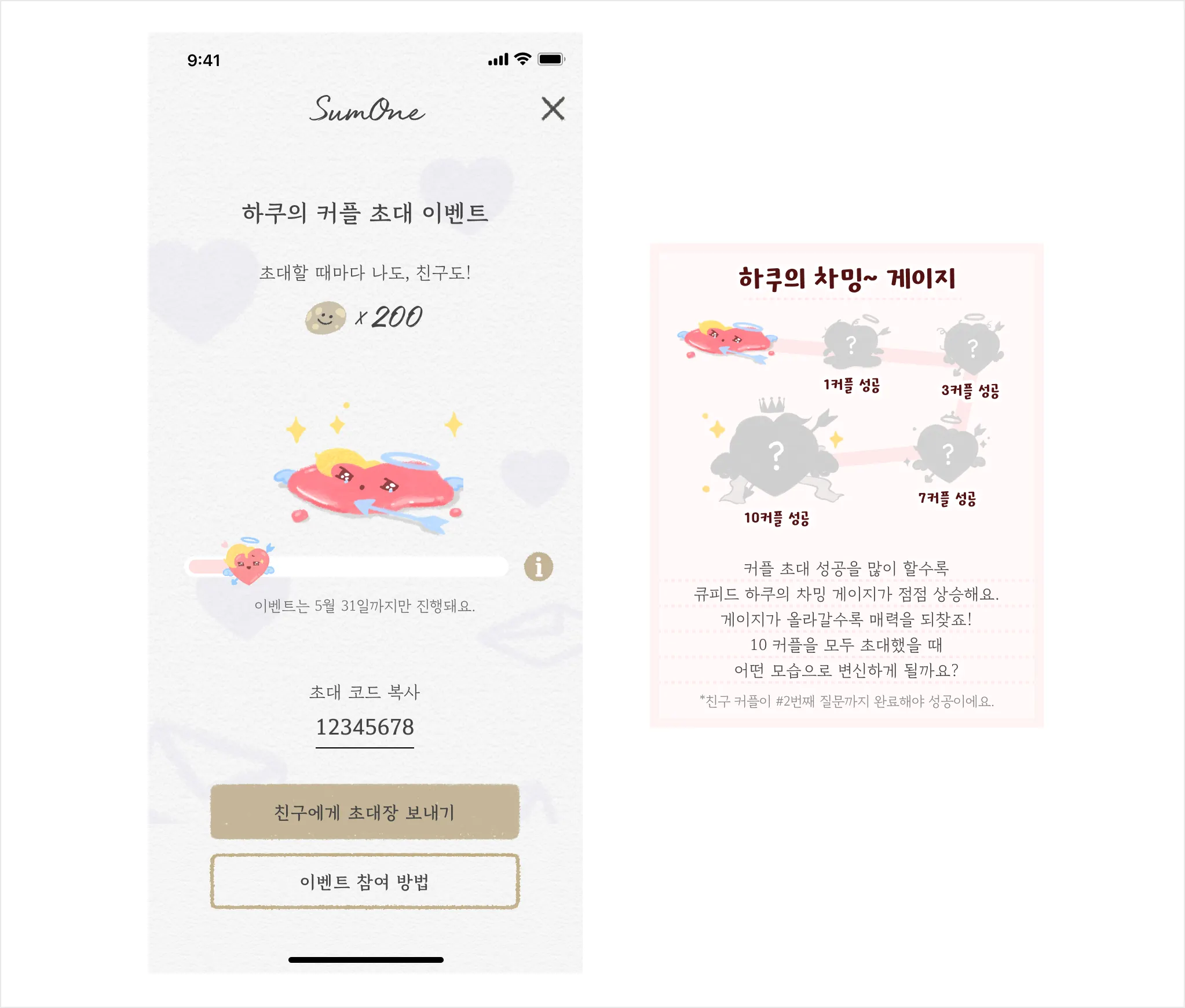 친구를 초대하면 조약돌을 받는다는 단순한 보상 체계를 너머, 초대를 성공할수록 UI 내 큐피드 하쿠의 모습이 점차 매력적으로 변하게 된다. 서버에 유저에게 발급된 코드와 초대 성공 수를 저장해두어 구현이 어렵지 않았다. 또한 친구 커플이 썸원을 이틀 사용할 경우, 기존 커플에게 푸쉬 알림도 발송해 보상을 바로 받을 수 있도록 했다.