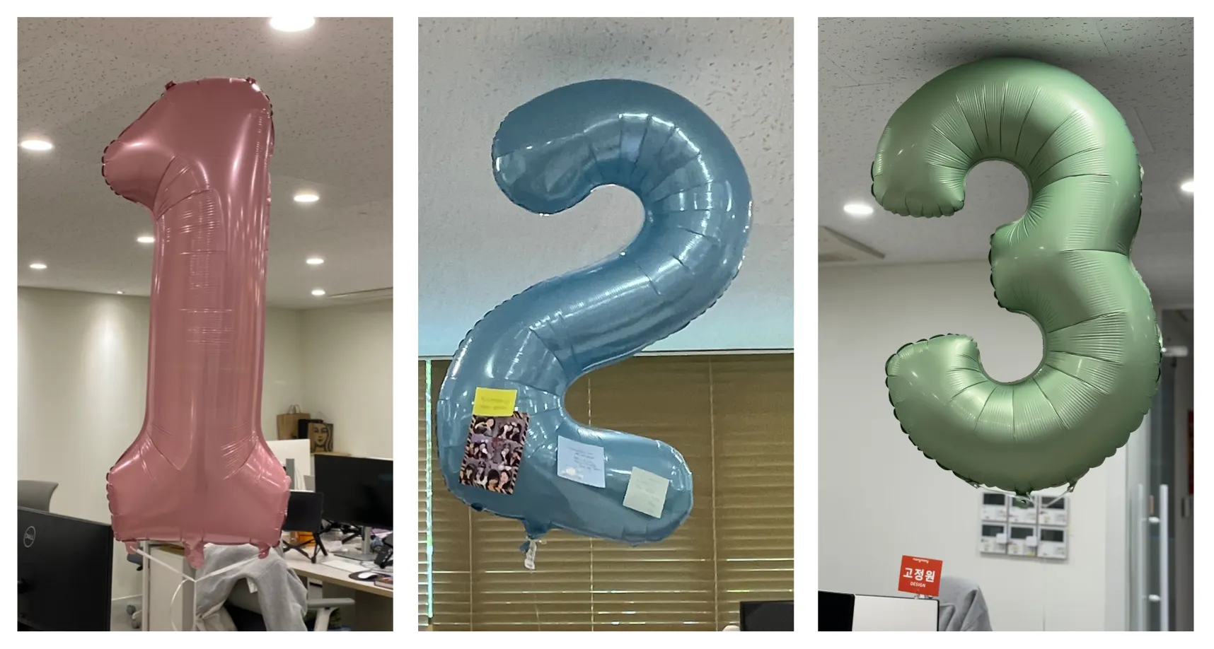 모니모니에서는 입사 기념일을 홀수 연도 마다 챙겨주는 복지가 있어요. 자리에는 커다란 풍선이 달리고, 타운홀에서 조촐한 파티를 하며 함께 케이크를 나누어 먹습니다. (풍선은 해마다 달려요!)
