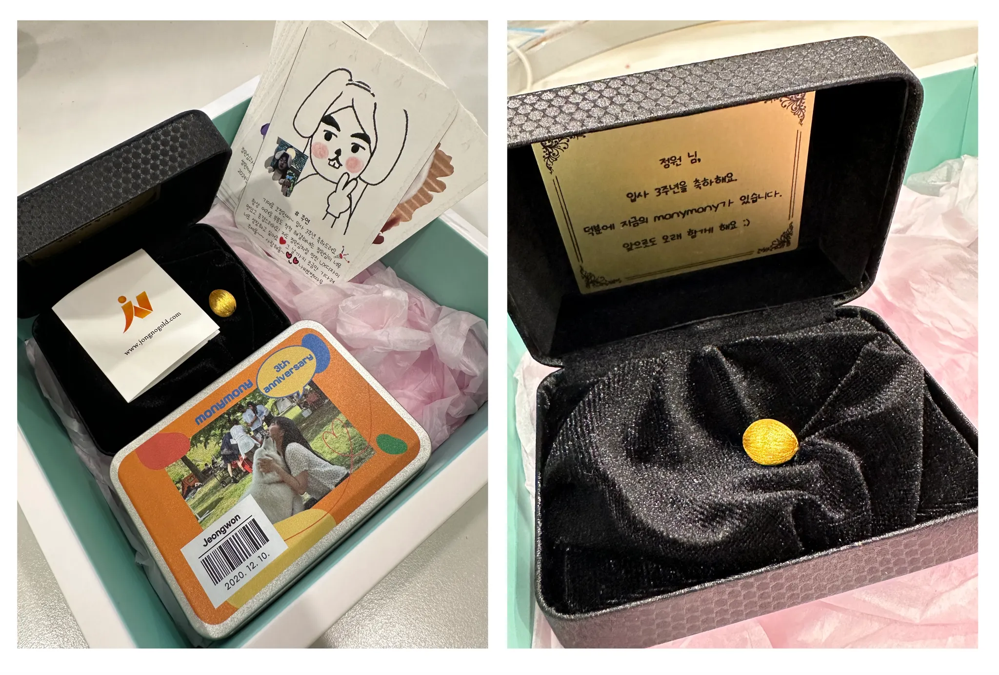 반려몽 모양의 순금 한 돈과 팀원 분들이 직접 써주신 포토 메시지 카드예요!