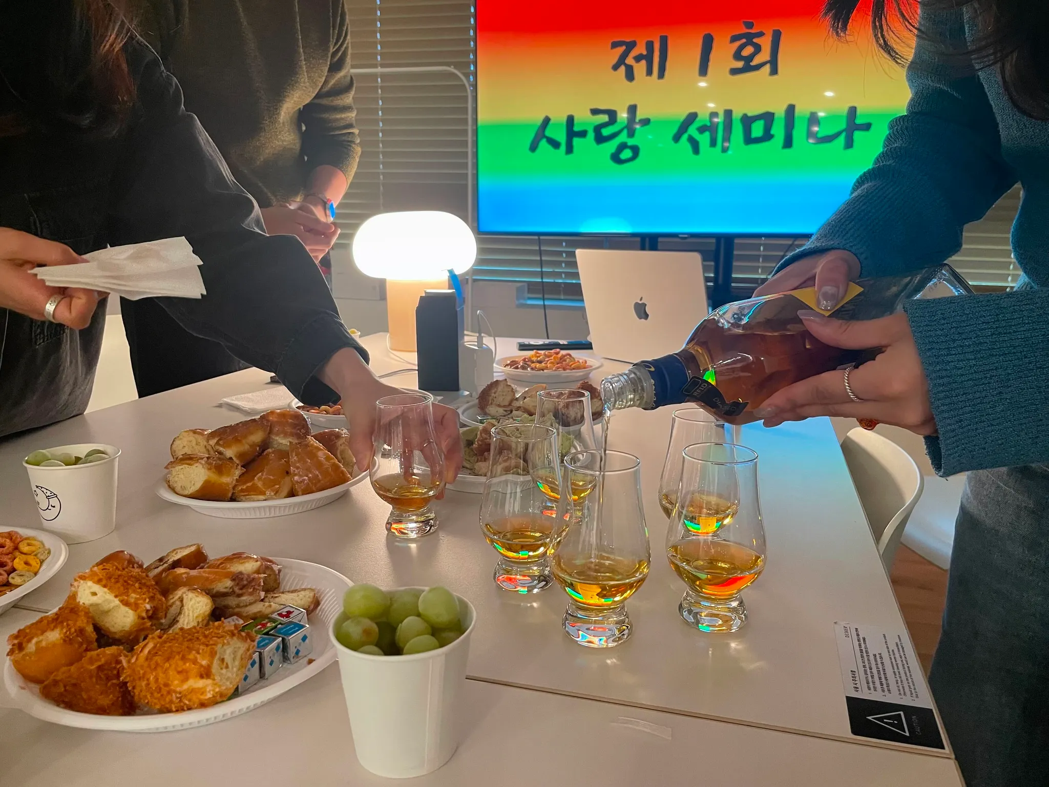 준비해뒀던 위스키와 핑거푸드, 냉장고에 있던 샴페인까지 다 비울 정도로 오랜 시간 대화가 이어진 세미나였다. 처음 기획할 때만 해도 1시간 동안 대화가 잘 이어지기만 해도 성공일 것이라고 생각했는데, 다들 이야기하다가 배가 고파서 햄버거를 단체로 시킬 정도로 빈 틈이 없는 알찬 세미나였다.